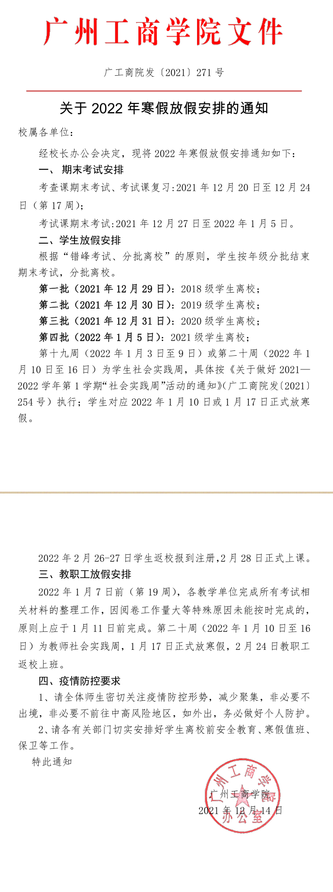 关于2022年寒假放假安排的通知