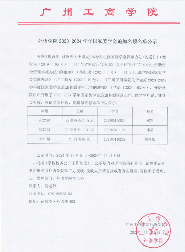 外语学院2023-2024学年国家奖学金追加名额名单公示
