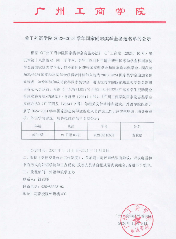 关于外语学院2023-2024学年国家励志奖学金备选名单的公示