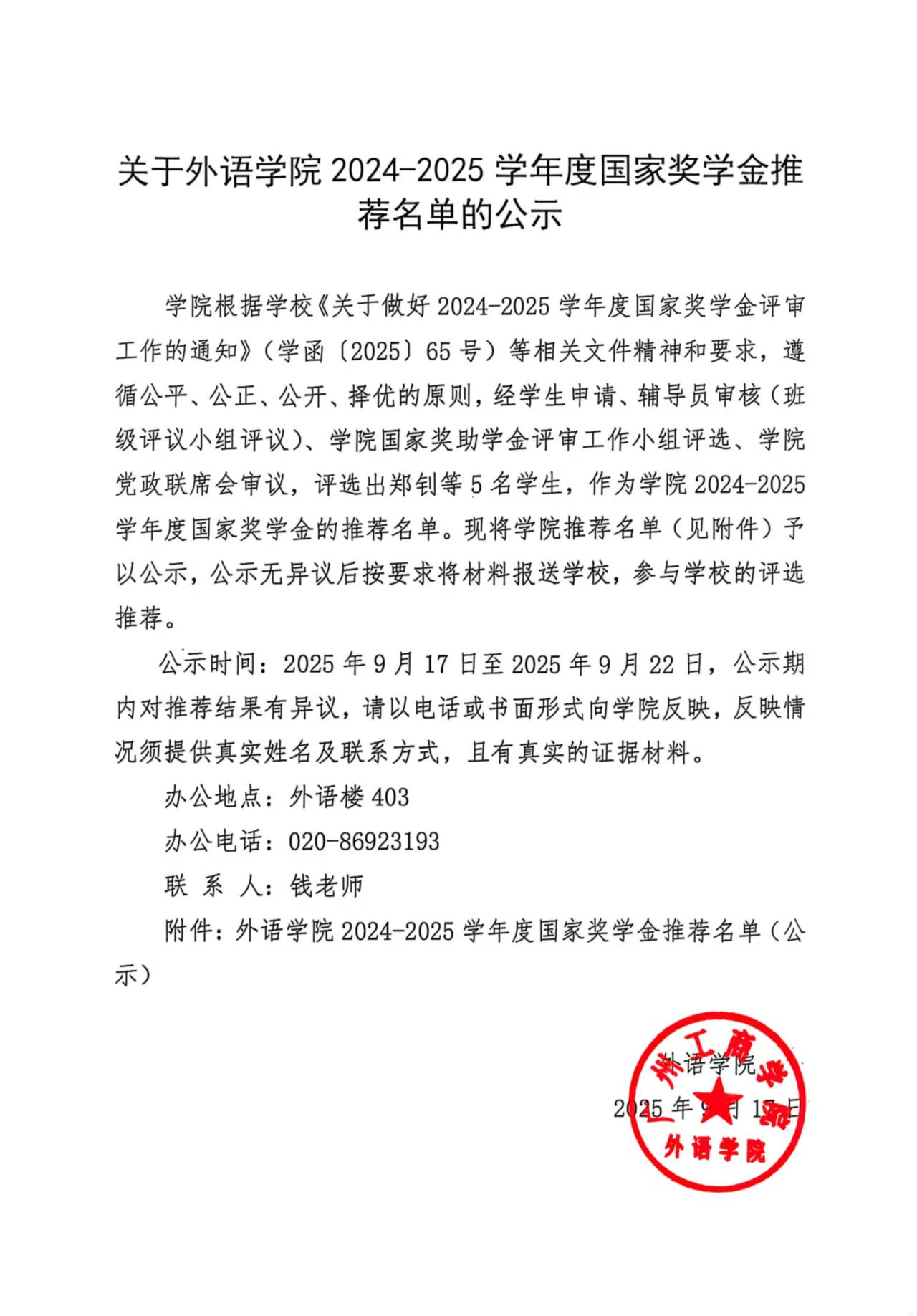 关于外语学院2024-2025学年度国家奖学金推荐名单的公示