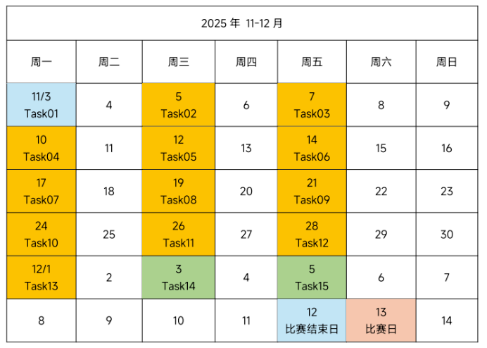 11月3日起每周一、三、五 07:00 自动发布1个比赛任务,共15个任务。所有任务的截止时间均为12月13日0点。