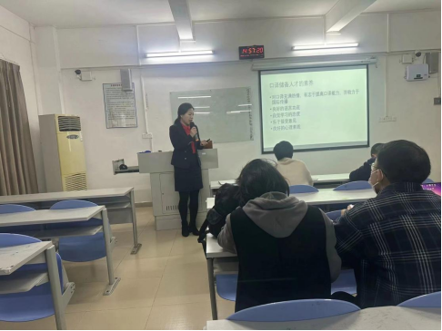 分享会上,《商务英语口译》课程组组长贺丹老师从口译能力的构成,备赛路径、反思与展望四个方面,结合本次指导古佳浩同学参赛的实际情况,向老师们详细介绍了指导学生参赛的心得与体会。特别指出了古佳浩同学此次参赛表现突出的方面及发挥不太好的方面,同时反思了今后指导学生参加同类型比赛时需要注意的各个方面。