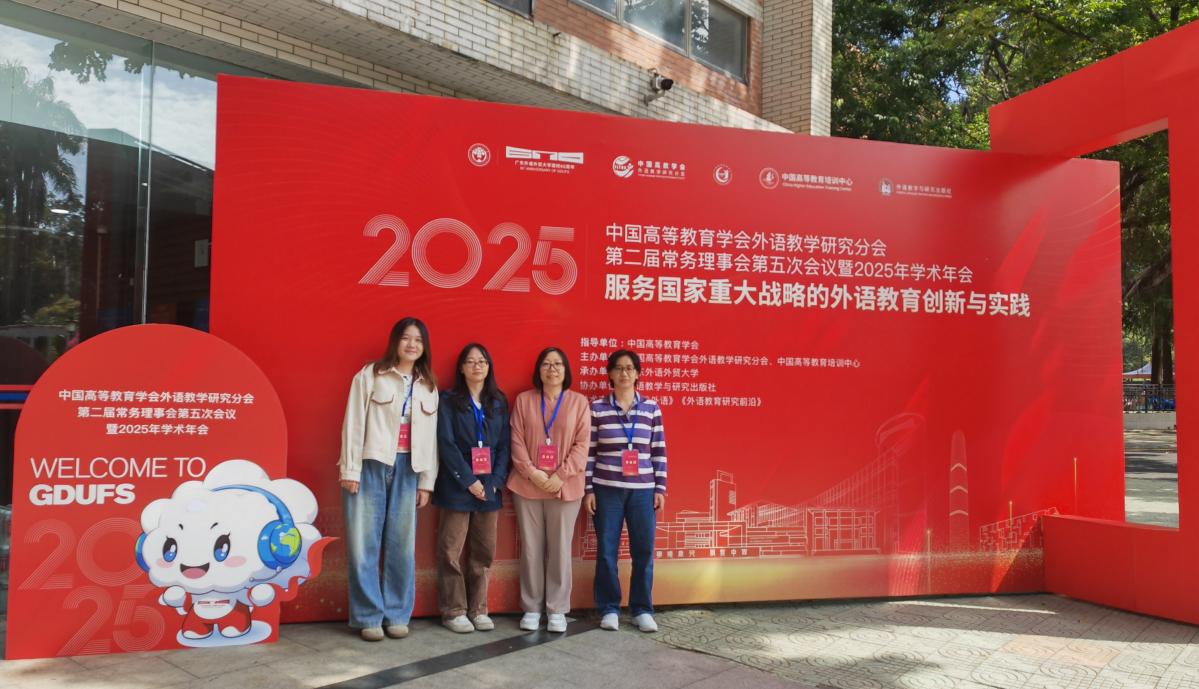 2025年11月1日-2日,由中国高等教育学会外语教学研究分会联合中国高等教育培训中心主办的2025年学术年会在广东外语外贸大学举行。来自全国各高校的专家学者齐聚一堂,共同探讨教育强国建设背景下的高质量外语教育体系建设,研究如何培养担当民族复兴大任的时代新人,为实现中国式现代化提供卓越人才和智力支撑。我院大学英语课程教研室苏东晓、胡玲玲、郭奉红老师和日语专业教研室商思航老师参加了本次会议。