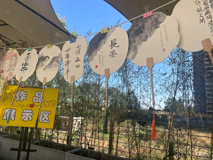 每个人用自己手中的画材,通过勾勒油墨灯上祖国的大好山河、将心中的母校用五彩的颜料填充在帆布包上、将青春的可爱模样绘画在一把把洁白的团扇上,他们恣意泼洒着颜料,肆意地发挥自己的创造力,用自己的画笔描绘青春的色彩,抒写内心对母校、对祖国的感恩之情。