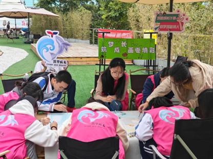 最先开始的是“筑梦成长画卷填彩”,大家一起围坐在绘画台旁填充画布。绘画台搭建在走廊的靠边一侧,项目成员们背靠着骄阳,面朝着画布,在微风的吹拂下挥动着手中的画笔,让校园的美丽渐渐显露。成员们在共同完成画卷填彩后,通过完成答题获得相应的画材:分别有团扇、油墨灯、帆布袋、画板和颜料,即刻回到大本营开展“自由绘画”创作。