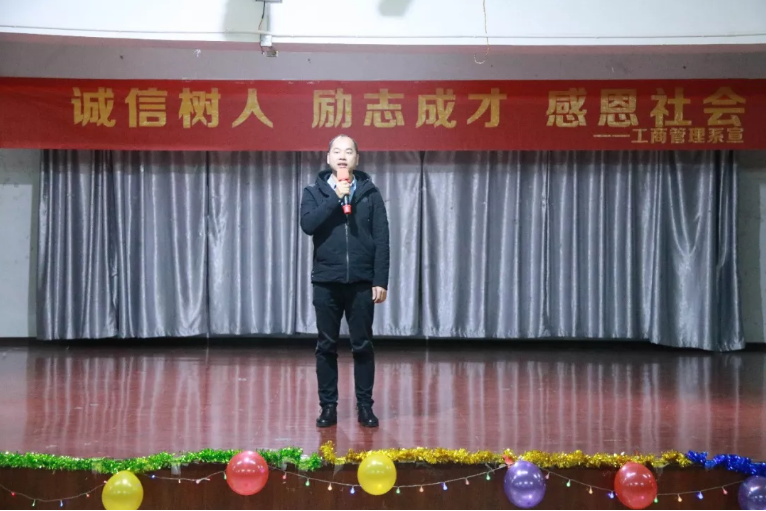 晚会的声,由王伟江老师上台致辞。王老师先是对到场的老师、同学以及为这场晚会做准备的工作人员表示感谢。接着,他表示此次晚会的每个节目都声情并茂。最后,他希望我系以后的每个活动都要有追求精益求精的精神,争取做到每次都有所进步。