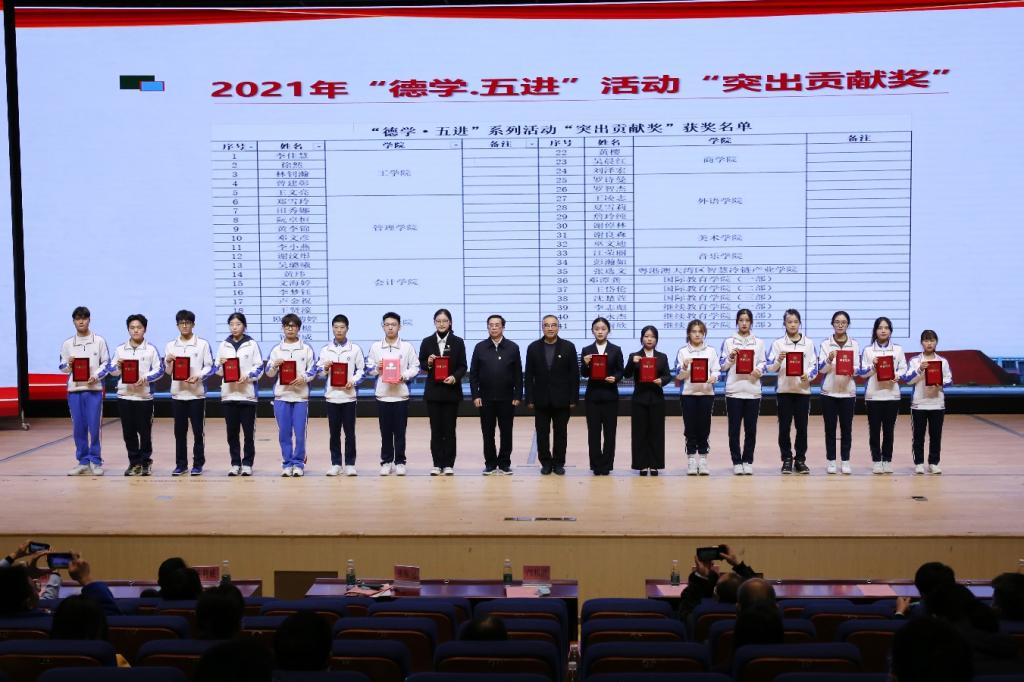 在今年开展的“德学·五进”系列活动中,涌现出一批表现优异、成绩突出的同学,树立了先锋模范作用,为学校“德学·五进”的深入推进作出了表率。学校党委书记张振超同志宣读《关于表彰2021年“德学·五进”系列活动中表现突出同学的决定》。邝邦洪校长与张振超书记一同为获奖同学颁奖。