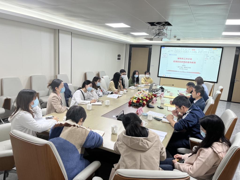 同时就疫情防控工作开展情况提出了两个方面的思考:一是如何将疫情防控与思想政治教育相结合。二是辅导员该如何准确正向理解并宣传教育属地疫情防控部门下达的疫情防控政策。明确方向后,与会人员纷纷在核酸检测、学生请假外出、健康信息填报等方面发表各自的观点,分享本学院疫情防控政策的宣传教育经验,针对个别老师提出的疑问和困难进行进一步的交流探讨,总结出可行性方案。