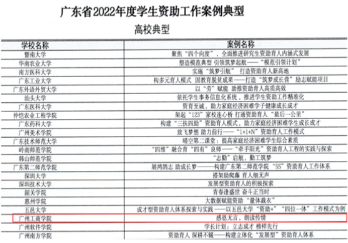 2月6日,广东省教育厅发布《关于公布2022年度广东省学生资助典型的通知》。beat365商学院报送的《感恩无言,朗读传情》案例获选为“广东省2022年度学生资助工作案例典型”。音乐学院陈丽娟、管理学院谢汶彤获评为“广东省2022年度励志学生成长成才典型”。