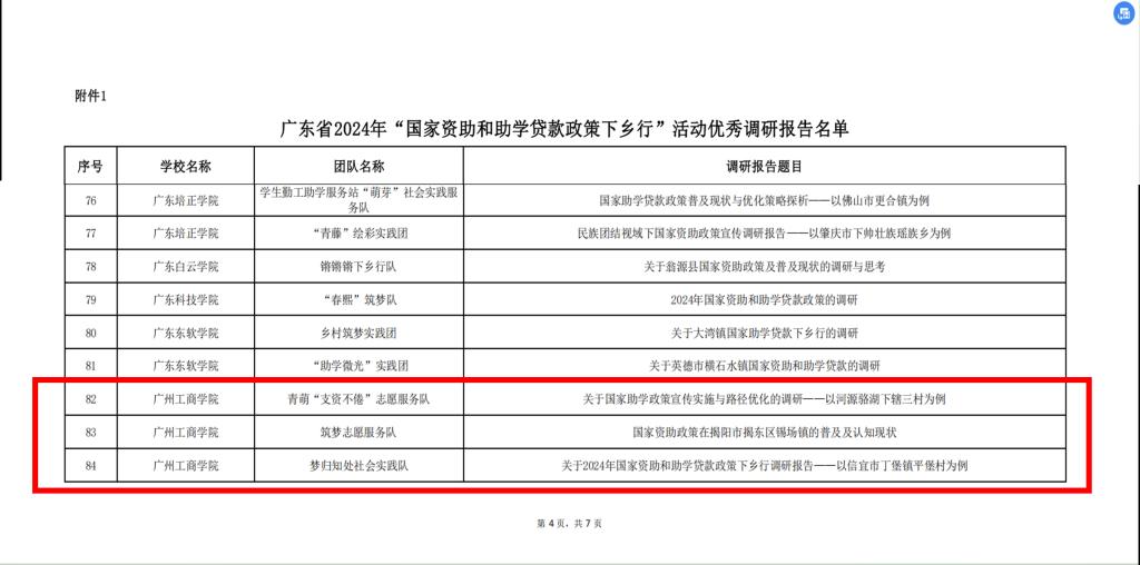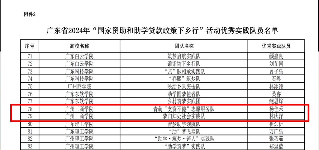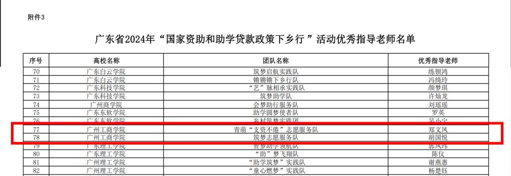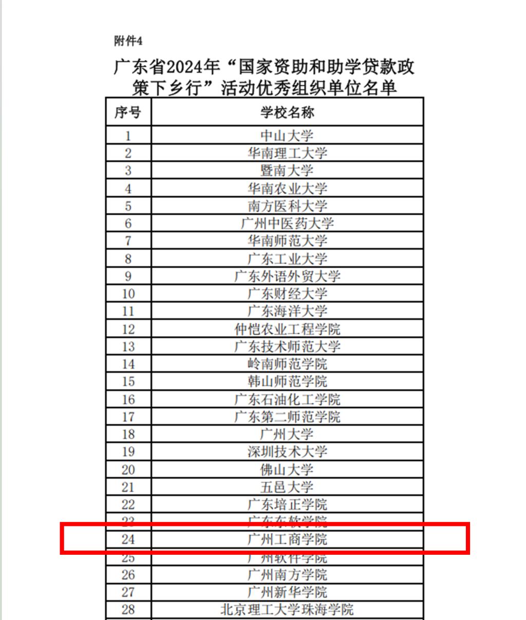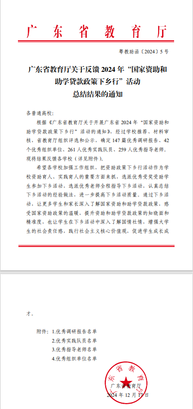 近日,广东省教育厅下发了《广东省教育厅关于反馈2024年“国家资助和助学贷款政策下乡行”活动总结结果的通知》(粤教助函〔2024〕5号),全省共评选出147篇优秀调研报告、42个优秀组织单位、261名优秀实践队员、259名优秀指导老师。beat365在线体育官网登录入口在广东省2024年“国家资助和助学贷款政策下乡行”活动中共荣获八个省级奖项,分别是优秀组织单位;优秀调研报告三篇;党委办公室郑文凤、管理学院胡国悦两位老师荣获优秀指导老师称号;商学院林庆阳、国际教育学院杨佳禾两位同学荣获优秀实践队员。
