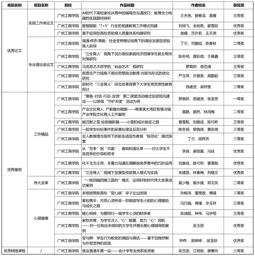 日前,2024年广东高校思想政治工作优秀论文、优秀案例、优秀网络课程评选结果公布。学生工作部选送的31项作品中,共有23项获奖。其中一等奖1项、二等奖3项、三等奖12项,优秀奖7项。
