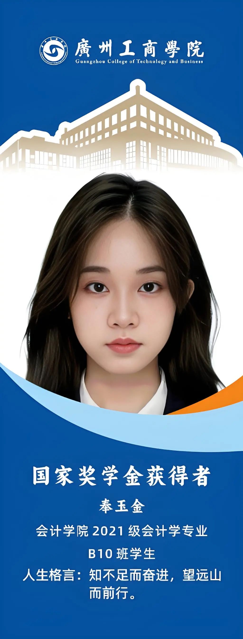 奉玉金,在大学期间思想上,积极向党组织靠拢;学习上,学业成绩和综测成绩均位于专业前列;科研上,主持国家级大学生创新创业培育项目1项和校级课题1项,公开发表论文5篇;学科竞赛上,获省级、市级、校院级23余项竞赛奖项;社会实践上,积极投身于志愿活动,不断提升个人综合素质能力。