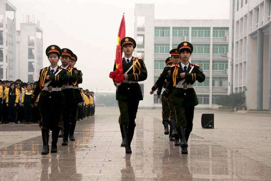 春风和煦,春色撩人。全体学生干部统一身穿校服,排着井然有序的队列,精神抖擞,气势昂扬。6点58分准时进行升旗仪式,随着热情洋溢的进行曲演奏,五星红旗冉冉升起,在阳光下散发光芒,随风飘扬。