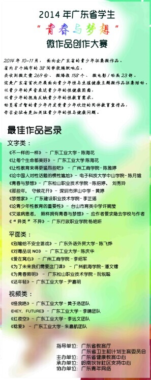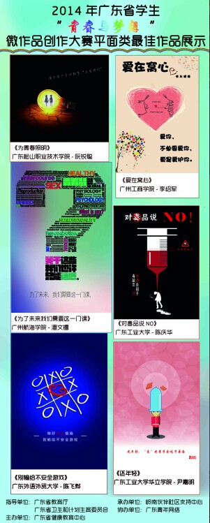 【本网讯】在2014年以“行动起来,向零艾滋迈进”为主题的广东省预防艾滋病青春健康教育活动中,我院学生处积极贯彻落实省教育厅关于做好2014年预防艾滋病和青春健康教育工作的通知精神,心理咨询中心积极组织各系学生参与到各项教育活动中,提高了大学生对预防艾滋病的科学认识,并荣获“2014年广东省学生‘青春与梦想’微作品创作大赛‘最佳组织奖’”,计算机系李绍军、公开学院陈雅婷同学的作品在众多作品中脱颖而出,分别获平面类“最佳作品奖”、文字类“最佳作品奖”。