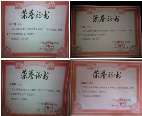 近日,学生处授予财金系11级涉外会计1班林欢、车广明、刘嘉杰、林明伟四位同学“科学探究积极分子”荣誉称号。
