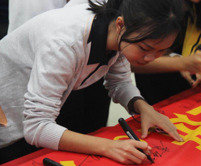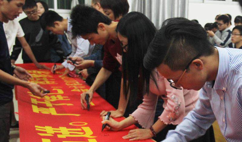 随后,艺术团带来的舞蹈《good time》将现场气氛推向高潮。令人愉悦的舞蹈过后,各班班委代表有序地上台面对系旗宣誓,他们庄严的表示会积极配合“学风纪律月”活动开展的工作并组织班级同学积极参加该项活动。宣誓过后,他们有序地在红布上签上了自己的名字。