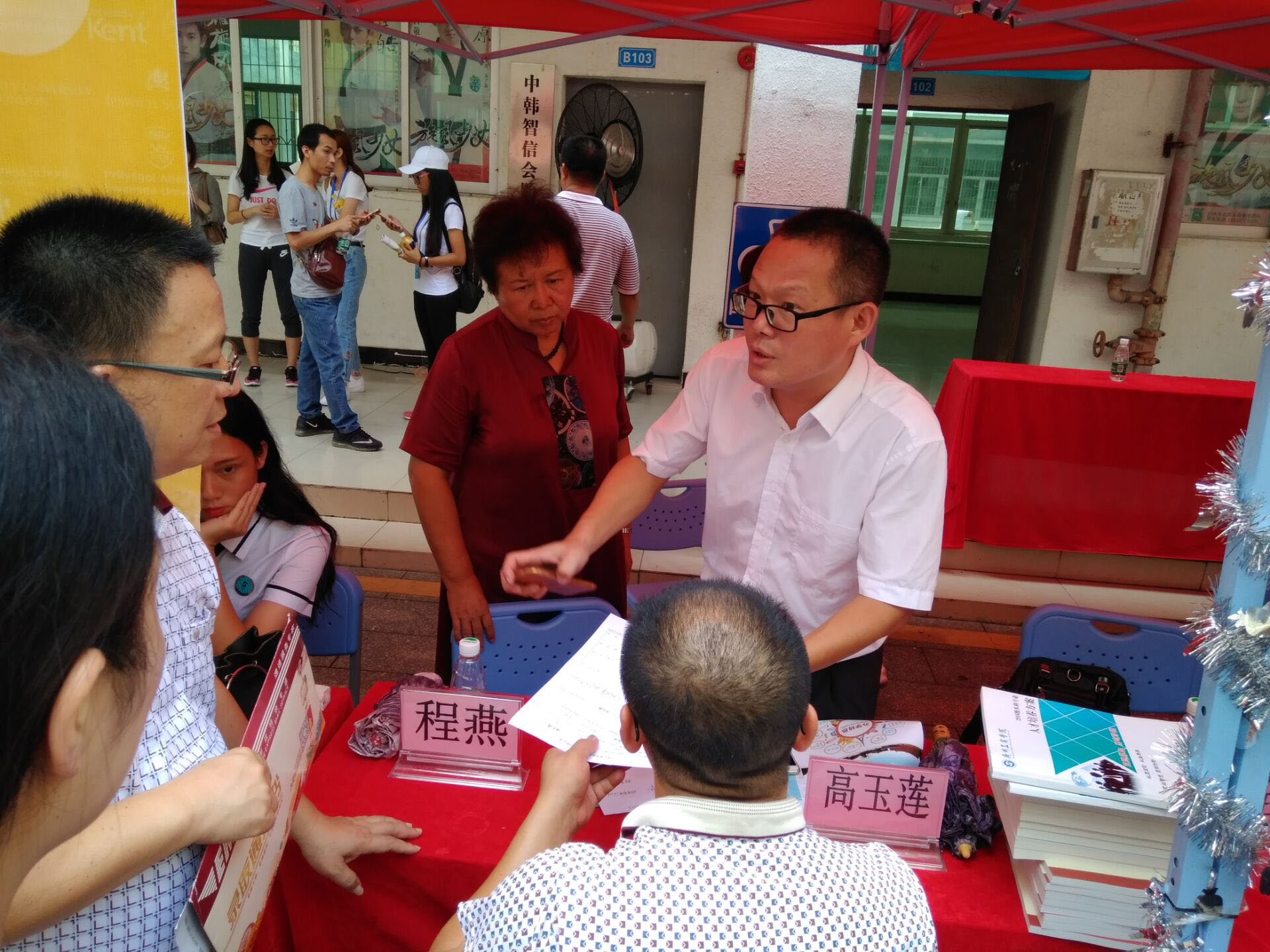 大本营中特别开设的专业咨询通道受到了各位家长的欢迎。志愿者在家长休息处体贴地摆上了遮阳伞,而且还设置了饮水处,供家长和新生休息和解暑。