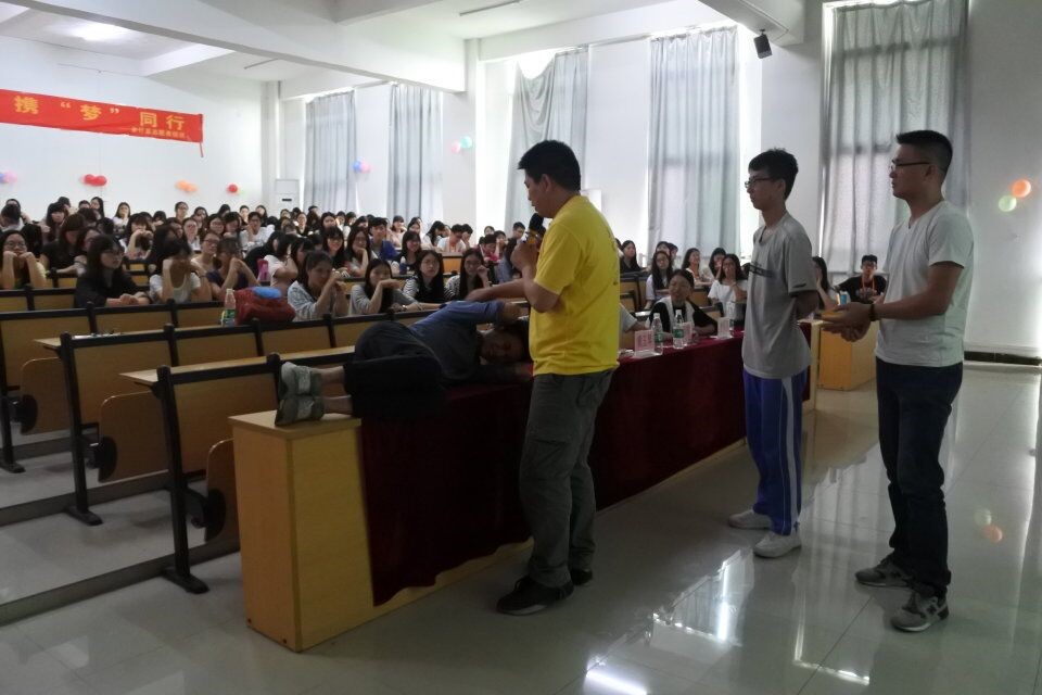 紧接着,李明英老师向各位志愿者讲述了有关青年志愿者的基础知识以及志愿服务精神的内涵。她不仅要求志愿者注重礼仪、规范姿态,还强调了志愿者的权利与义务是共存的。在培训接近尾声之际,卢金养老师还向志愿者们传授了常用的急救常识。他以实例讲解水上救援和做心肺复苏的方式,并与学生进行配合,现场演示了当发生踩踏时如何进行自救。最后,他对每位青年志愿者寄予了希望,希望他们能少说多做,默默奉献。在热烈的掌声中,本次培训活动圆满结束。