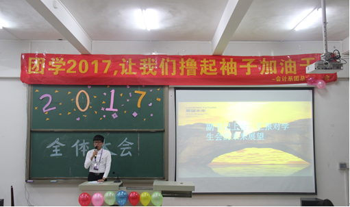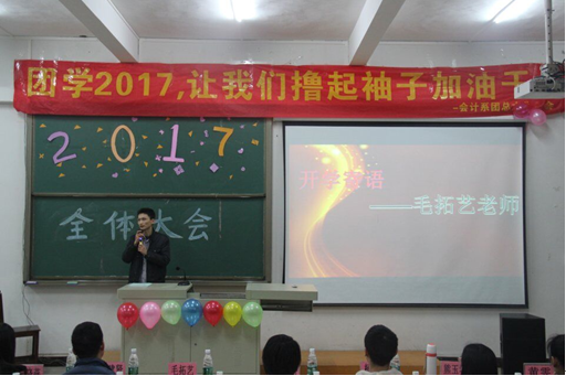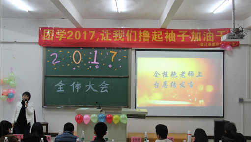 紧接着,由杨新伟老师宣布会计系团总支学生会主席及团总支副书记人选,并用“让我们撸起袖子加油干”以及“越奋斗越青春”的口号,鼓舞同学们的士气。学生会主席郭玉玲同学上台就上学期团学活动做出总结,肯定以前取得的成绩并指出不足之处,争取在未来取得更好的成绩。团总支副书记杨涵提出了对学生会的未来展望和学期工作计划。
