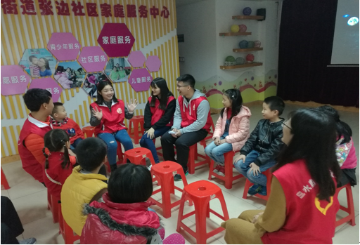 2017年3月11日,缘梦公益团队的指导老师和队员一起到校外志愿服务合作单位三水西南张边社区家庭服务中心组织开展“淼童·彩虹桥”阳光少年成长营开班仪式暨团建活动。