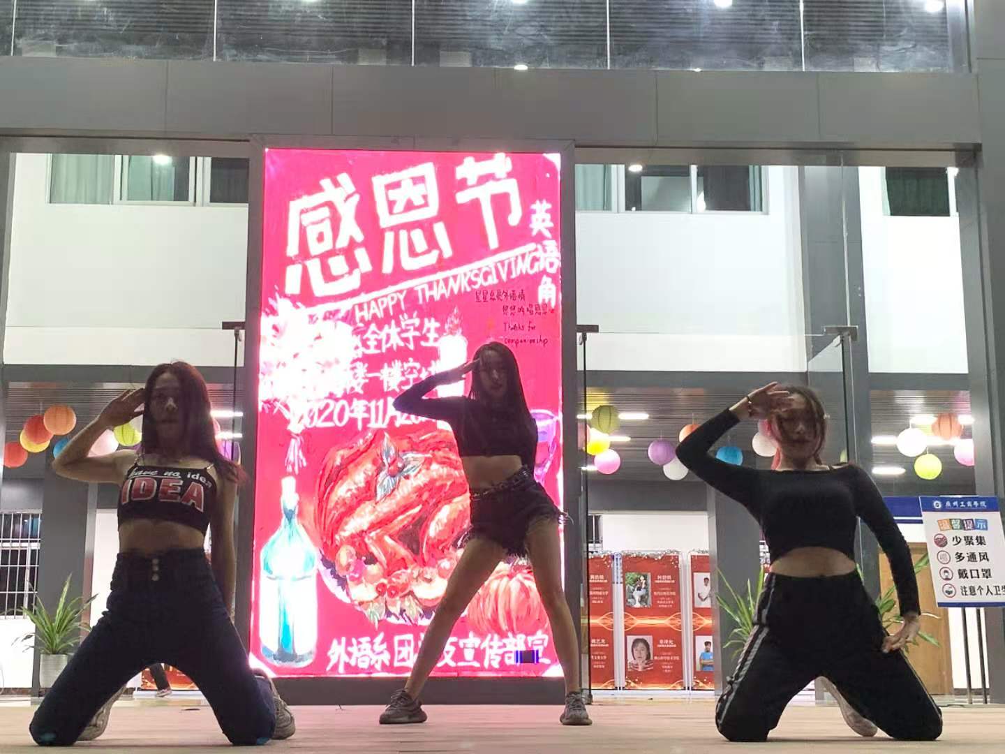 本次活动区域分为游戏区、拍照区、美食区,系统化的经营模拟使活动氛围持续高涨。主持人进行简洁的开场白后,舞蹈编导专业的同学们为我们带来了精彩的舞蹈表演《Spice girls》,将冬日中同学们的热情点燃了起来。随后,特邀嘉宾外语系团总支书记苑广伟老师发表致辞。苑老师在讲话中表示,感恩节在每年11月第四个星期四到来,旨在让人们心存感恩,感谢身边每一个帮助自己的朋友。同时,感恩节英语角活动作为外语文化节活动中重要的一环,他希望同学们借此活动能提高外语兴趣,发扬我系优良作风,了解西方文化,获得对自身专业学习方面的启迪,提高自身专业的素质。活动中,伴随着欢乐的音乐,同学们在活动场所内尽情施展自己的外语才华,不断地闯关挑战,在游乐与吃喝中感受感恩节的深刻含义。在荧光闪闪的外语楼一楼空地上,同学们凝聚起感恩之心,在感恩节的活动中慢慢收获自己宝贵的感悟。