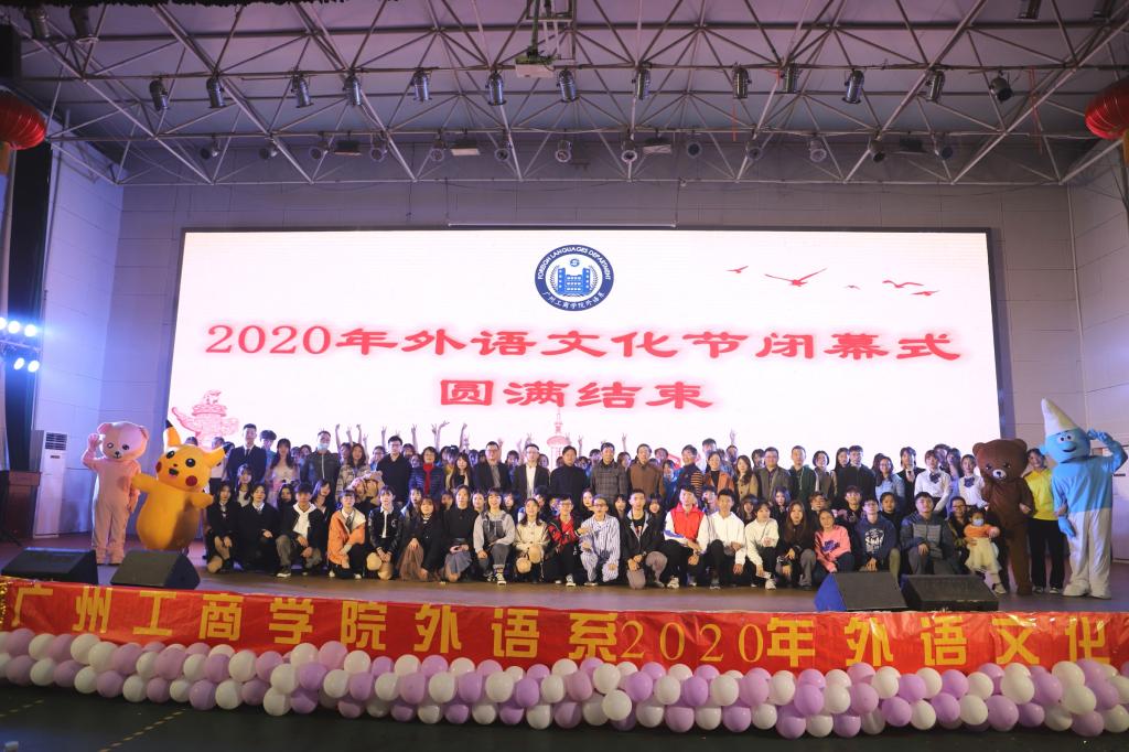 2020年12月8日19:00,beat365在线体育官网登录入口外语系2020外语文化节闭幕式于花都校区体育馆隆重举行。莅临现场的领导嘉宾有:外语系主任高凤江教授、学院党委副书记、院长助理兼学生处处长黄鹏同志、外语系副主任邢佳平老师、外语系副主任谢秀珍老师、外语系日语教研室主任陈光教授、外语系商务英语教研室马敏教授、外语系党总支副书记、办公室主任陈钧议老师、广州金嗓音文化发展有限公司销售部经理沈成龙先生、广州市卡贝路贸易有限公司人力资源副总监赵胜芳女士、广州市雅欧森姆皮革原料有限公司总经办白鹏程先生,以及各院系团总支书记、外语系教师代表及全体学工组老师们。
