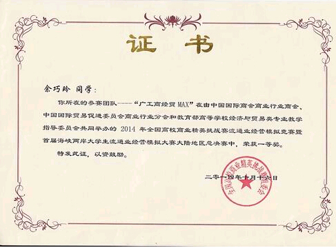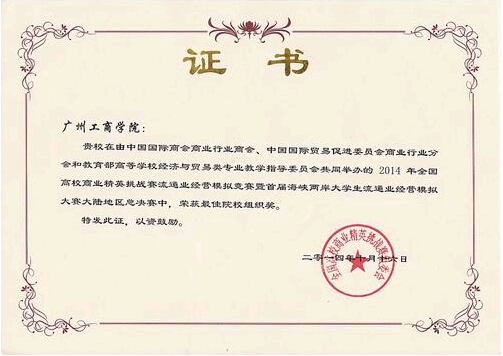 【本网讯】2014年10月14日,我院经济与贸易系在2014年全国高校商业精英挑战赛流通业经营模拟竞赛暨首届海峡两岸大学生流通业经营模拟大赛大陆地区总决赛中获得全国一等奖一个、二等奖二个、三等奖一个的好成绩。