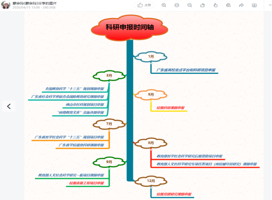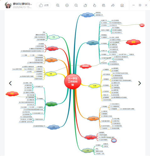 蒙宗玲老师分享了辅导员工作的心得,通过思维导图梳理了大一新生辅导员的工作重点,并用“时间轴”列出了适合辅导员科研项目的申报节点,给大家的工作提供了科学化参考。