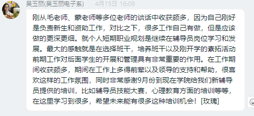 会上,主持人简要介绍了我院辅导员队伍的基本情况,邀请学院两位辅导员工作超过10年的资深代表,首批副处级辅导员工商系蒙宗玲老师和经贸系毛拓艺老师在会上作了经验分享。