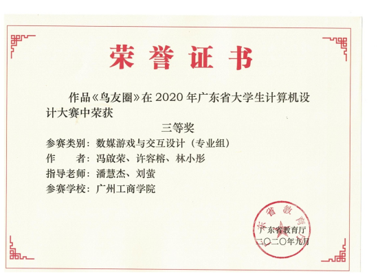 (5)2020年9月,获全国大学生计算机设计大赛广东赛区三等奖,颁发单位:中国大学生计算机设计大赛组织委员会;