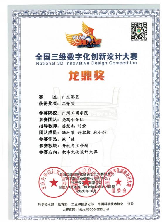 (6)2020年10月,获全国三维数字化创新设计大赛广东赛区二等奖,颁发单位:全国三维数字化创新设计大赛组委会;