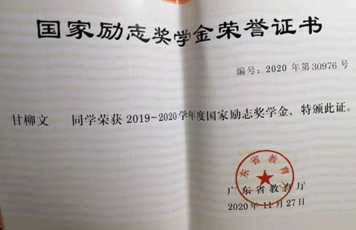 5)2020年11月,获2019-2020学年度国家励志奖学金。