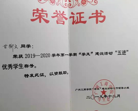 3)2019年12月,获2019—2020学年第一学期“学风”建设活动“五进”优秀学生称号。