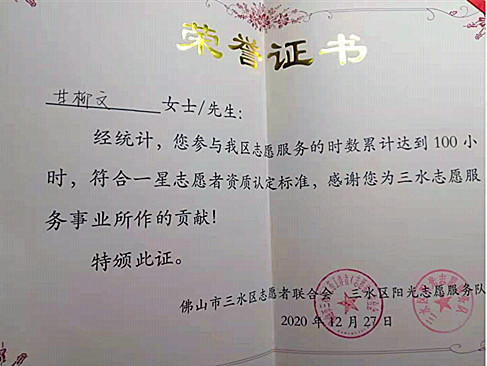 6)2020年12月,获佛山市三水区志愿服务一星志愿者称号。