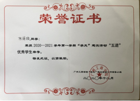 (5) 2020年12月,获“学风”建设活动“五进”优秀学生称号;