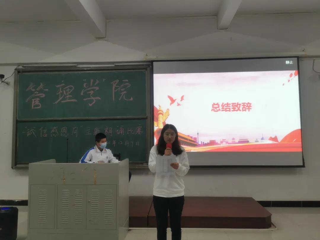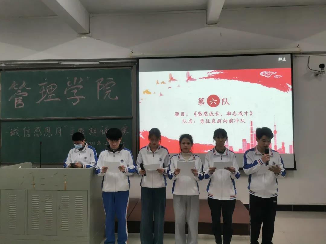 【本网讯】为响应学校“德学五进”的号召,弘扬中华民族的传统美德,全面提升学生的思想素质,扎实展开德学教育,管理学院于12月9日晚19:00,在一实C107举办了“诚信感恩,励志青春”主题朗诵比赛。出席朗诵比赛的嘉宾有管理学院副院长邹剑峰副教授,管理学院学工办主任谭一酉老师,管理学院学工办副主任张永训老师,管理学院学工办副主任余远远老师,管理学院学生第四党支部宣传委员覃旭芳老师,管理学院学生第四党支部组织委员高凤相老师。