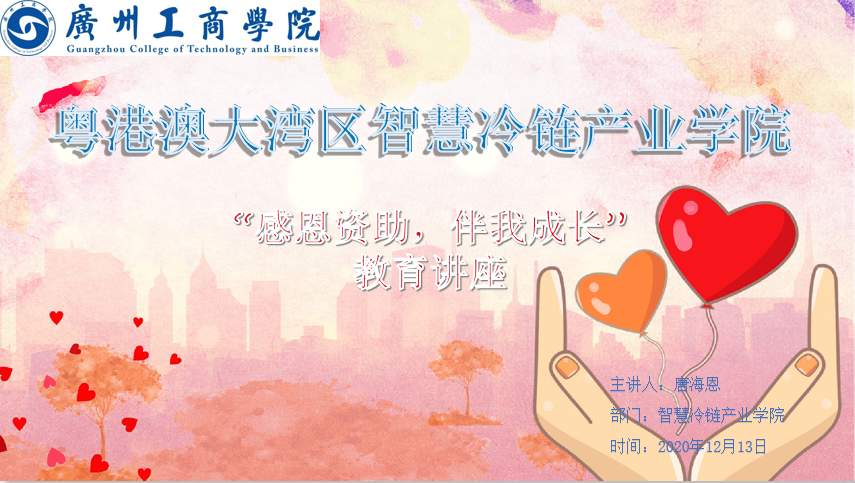为积极贯彻beat365在线体育官网登录入口“以德为行,以学为上”的教育思想,提高学生的诚信感恩意识。产业学院于2020年12月10日早上10点,在教Ⅱ-C405举行了以“感恩资助,伴我成长”为主题的教育讲座。本次讲座由产业学院辅导员唐海恩老师作为主讲人,为产业学院所有通过贫困认定的家庭困难学生与生源地贷款的同学进行感恩教育。