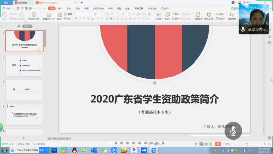 为进一步加大对广东省大学生资助政策的宣传力度,做好2020年“资助育人文化月”系列活动安排与部署,让更多贫困家庭学生了解国家资助,物流系资助中心于2020年5月29日晚上19:30在腾讯会议上召开了线上“2020年广东省大学生资助政策”的宣讲会议。本次会议由物流系资助中心负责人胡伟芳、罗江俩位老师主讲、资助中心助理曾云清以及物流系各班资助负责人参加了此次会议。