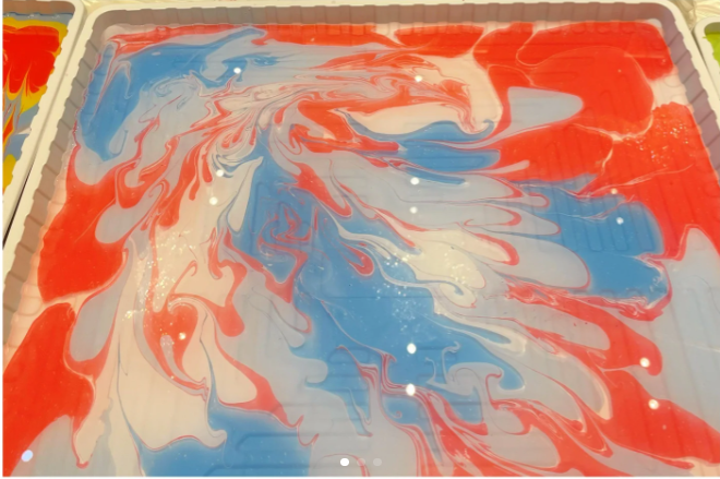 在水拓丝巾画活动中,现场会提供丝巾、水拓原画液、水拓颜料和固色剂,同学们可以发挥自己的想象力创造出自己的水拓画。