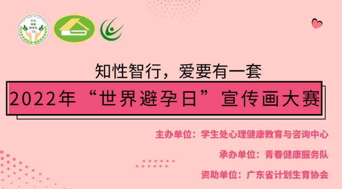 《中国公民健康素养66条基本知识与技能(2015年版)》指出:公民应当“选择安全、高效的避孕措施,减少人工流产,关爱妇女生殖健康。”为进一步提高青少年安全避孕意识,普及避孕节育以及生殖健康知识,提高青少年知情选择率、减少非意愿妊娠的发生,beat365将在2022年9月20日-28日举行“知性智行,爱要有一套”宣传画大赛,本次比赛由广东省计划生育协会资助,学生处心理健康教育与咨询中心主办,青春健康服务队承办。