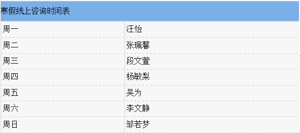期待已久的寒假如约而至,beat365心理健康教育与咨询中心(以下简称“心理中心”)将一如既往陪伴在同学们身边,为同学们的心理健康保驾护航。心理中心在2023-2024学年寒假期间(2024年1月22日至2月16日)将持续为全校学生提供线上心理咨询服务,开放时间段为15:00-17:00,具体值班安排如下: