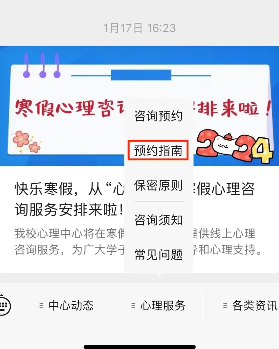 预约成功后,请您提前10分钟到达心理中心,以完成相关信息的登记,避免占用正式咨询时间。