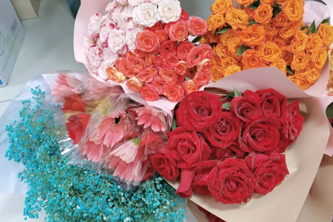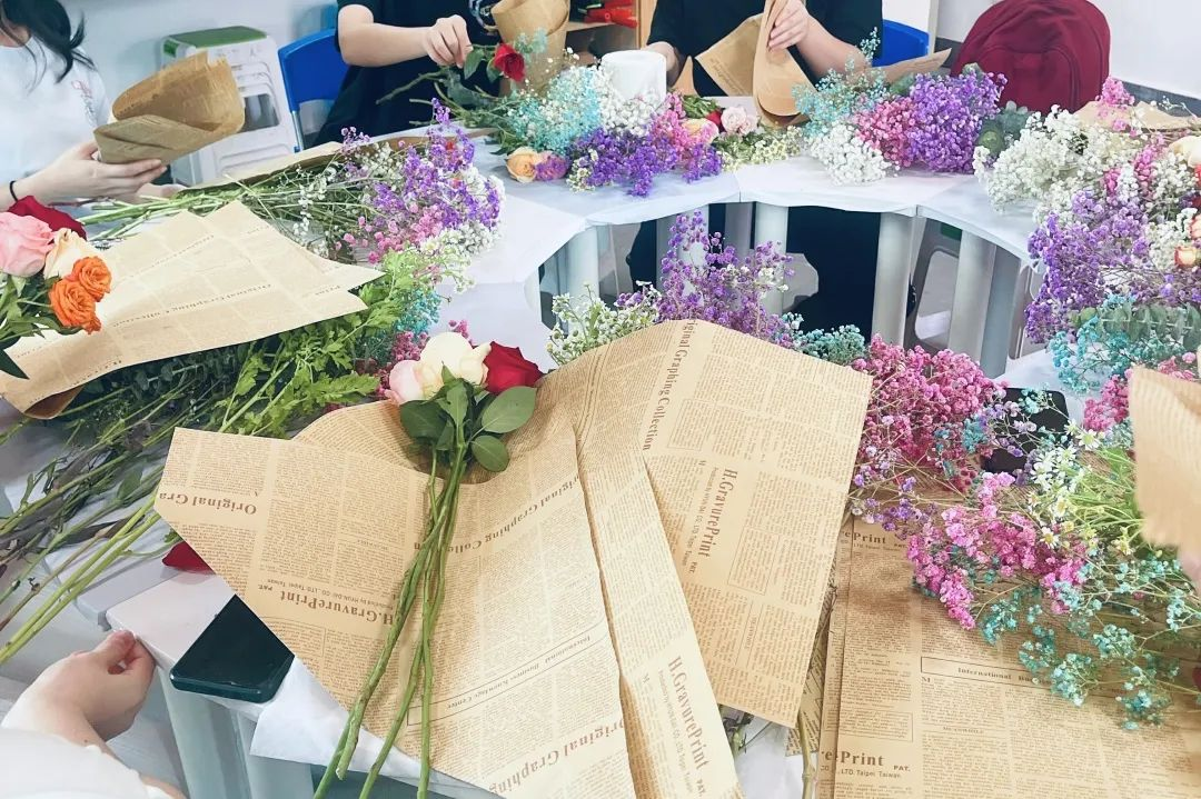活动现场,花香四溢,各种鲜花、绿叶、花枝等插花工具放在桌上。同学们围坐在桌子旁,拿起剪刀、包装纸等工具,充分发挥自己的创意和想象力,将各种花卉、绿叶巧妙搭配,创造出了一幅幅精美的插花作品。