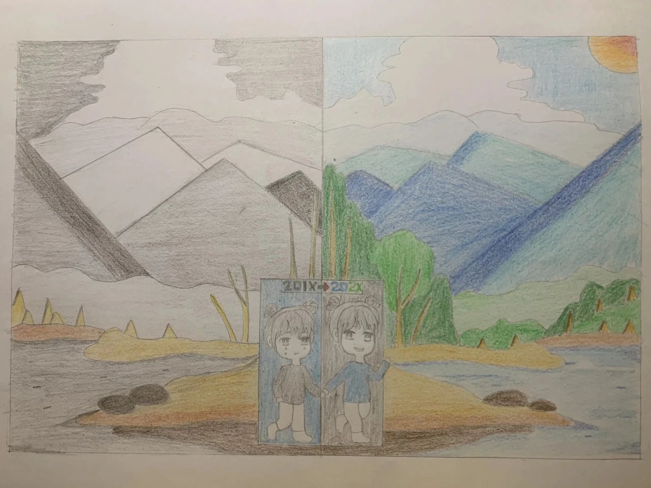 本作品两边绘制的景物一样,但是一边以黑灰色为主色,一边以蓝绿色为主色,用来表现主人公所处的环境变化,从而通过过去灰暗的环境与现在的环境进行对比,来告诉人们要告别过去灰暗人生,迎接全新多彩人生。