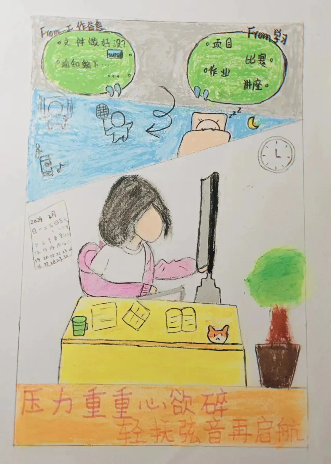 《重压轻抚再启航》是一幅反映学生生活压力与情绪调节的绘画作品。创作背景源于普遍的大学生活场景,其中学业、工作和时间管理成为学生们面临的主要挑战。通过作品想要表达尽管压力如山重,但适当的放松和调节让我们在挑战中重新找到前进的动力和方向。在创作思路上,画面聚焦于一位处于混乱书桌前的学生,周围环绕着象征工作压力和未来规划的文字信息,凸显出学生的内心世界和对未来的不确定感。同时,“轻抚弦音再启航”这样的文字则传递出一种积极的信息,暗示通过音乐等放松方式可以缓解内心的压力。创作目的在于鼓励面临类似困境的人们,识别生活中的压力源,并采取有效的方法来应对,即使在压力之下,也不应放弃对美好生活的追求和规划。