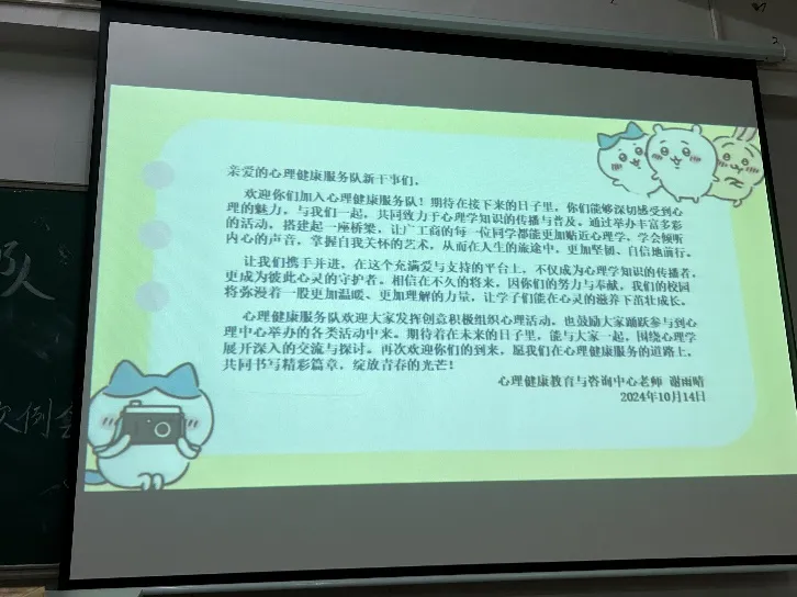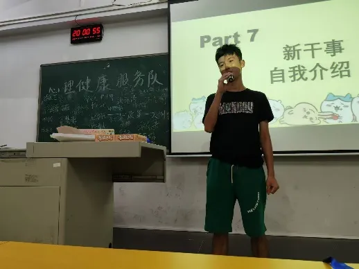 各部门部长依次上台进行自我介绍和部门介绍,他们不仅分享了各自部门的职责与特色,还讲述了加入心理健康服务队的初心与愿景。指导老师向新干事们表达了热烈的欢迎和殷切的期望,鼓励大家在未来的工作中积极进取,为提升校园心理健康水平贡献力量。