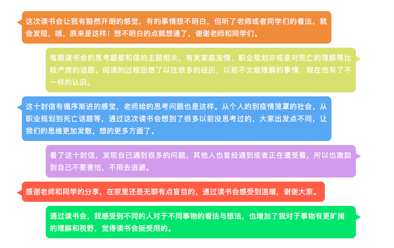读书会期间,我们共同讨论了职业方向、疫情影响、生活中的坚持、他人的评论、甚至对死亡的理解等等议题,引起每个人的思考,并对生活有了不一样的理解。