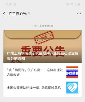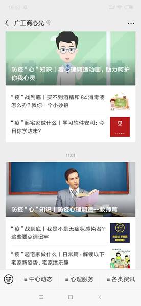 三、打造心理健康教育宣传阵地,为师生的身心健康“加油”。抗疫期间,心理中心公众号“广工商心光”开设了《防疫“心”知识》、《“疫”战到底》和《“疫”起宅家做什么》三个栏目,定期通过微信公众号发布抗疫期间心理保健知识和防疫保健知识,科普防疫知识的同时,陪伴大家渡过“漫长”的寒假,给大家提供必要的心理支持。
