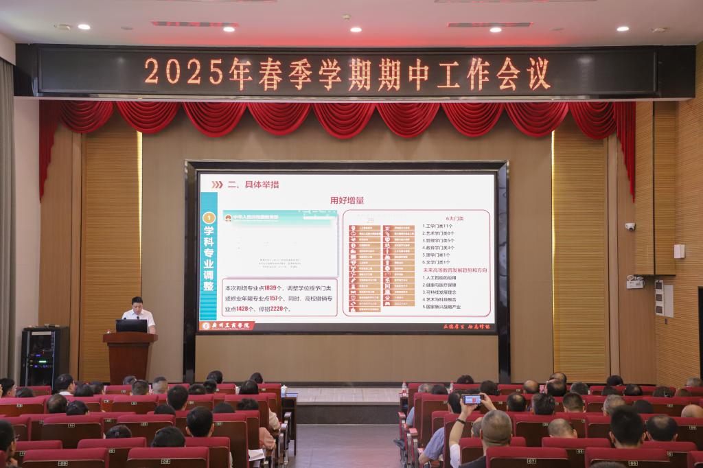 校长助理易亚军以“以整改促改革,强内涵,奋力推进学校高质量发展”为题,汇报了下半学期合格评估整改工作安排。他从任务要求、具体举措和目标实现三个方面精准部署。他指出,在紧盯评估专家组提出的6方面21条主要问题的同时,要重点推进学科专业调整、微专业建设、数字化转型与专业集群发展等工作;要以顶层设计、研究战略战术、实施行动计划为指引,形成办学品牌,全力推动学校内涵建设与高质量发展。