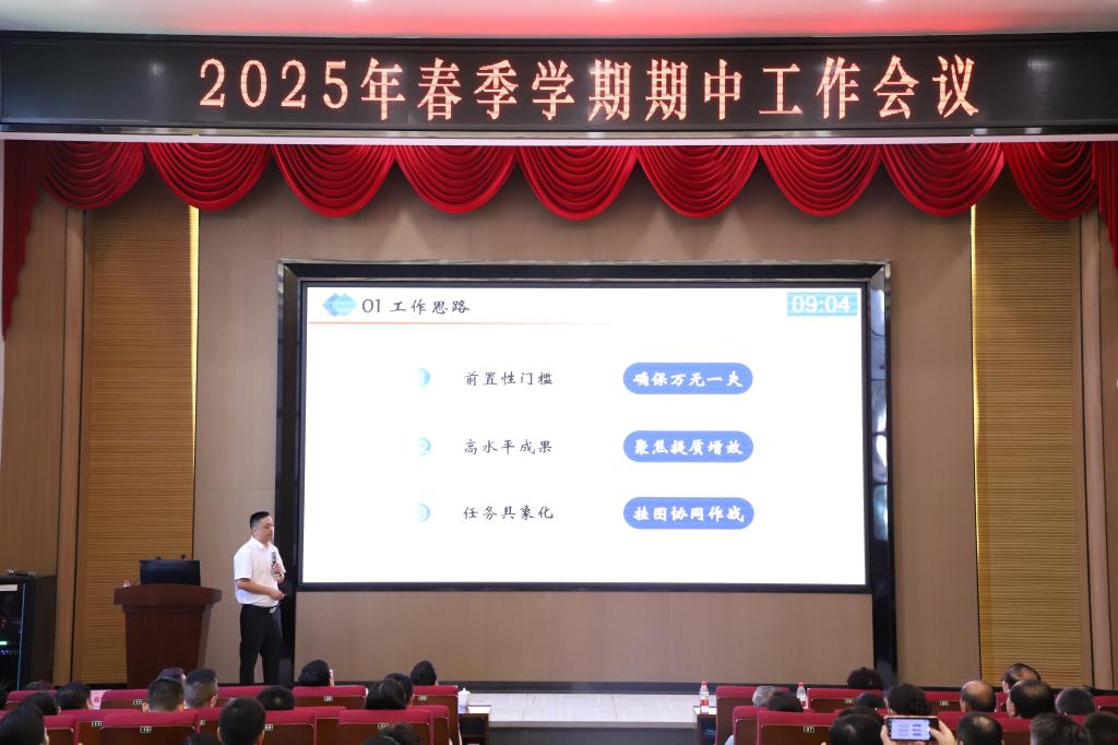 【本网讯】5月15日下午,学校召开2025年春季学期期中工作会议,总结及梳理本学期开学以来的工作,努力开创工作新局面。学校董事会领导出席,全体校领导、全校中层干部参加。会议由学校党委书记主持。